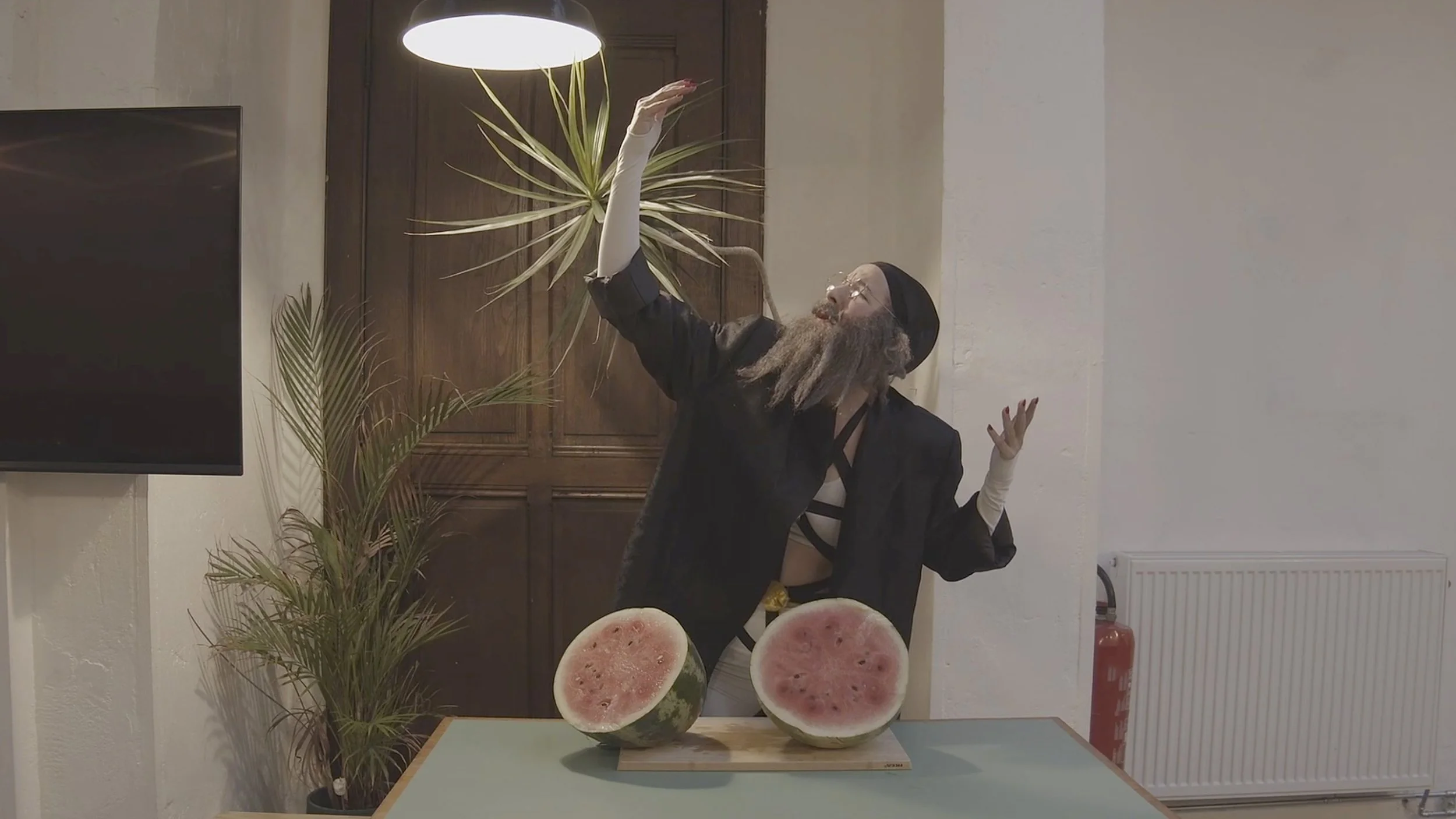 The Psychedelic Tzadik and the Watermelon, Extra City Kunsthal, Antwerp, Belgium, April 2024 (film still Mary Szydlowaksa).